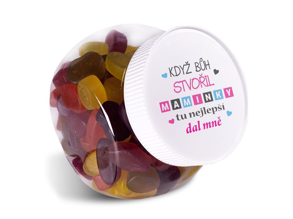Gumové bonbóny s originálním motivemOchutnejte výborné gumové bonbóny různých příchutí a dopřejte sobě nebo vašim blízkým požitek z mlsání. Na víku nádoby je personalizované věnování pro každého, komu chcete udělat radost. Vlastnosti:objem 1 litrrozměry nádoby 140 x 140 x 100 mmmateriál nádoby plastDoplňkové parametry