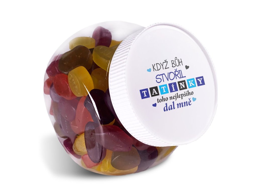Gumové bonbóny s originálním motivemOchutnejte výborné gumové bonbóny různých příchutí a dopřejte sobě nebo vašim blízkým požitek z mlsání. Na víku nádoby je personalizované věnování pro každého, komu chcete udělat radost. Vlastnosti:objem 1 litrrozměry nádoby 140 x 140 x 100 mmmateriál nádoby plastDoplňkové parametry