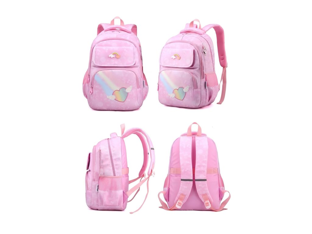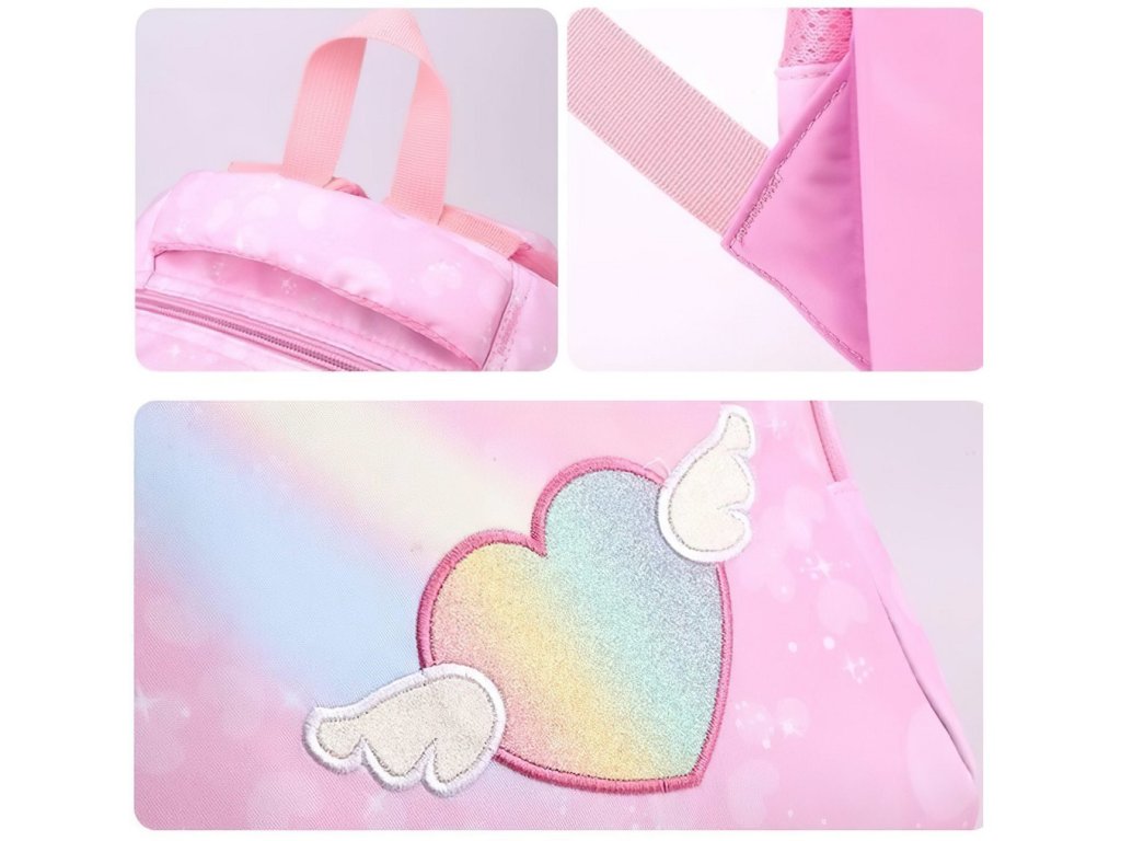 Tento roztomilý školní batoh s motivem duhy, srdíčka a jednorožce je ideální volbou pro malé princezny, které chtějí ve škole zazářit. Jemný růžový design s pastelovými detaily dodává batohu jedinečný a hravý vzhled. Hlavními motivy jsou duhové srdce s křidélky a nášivka duhy s obláčkem, které podtrhují kouzelný styl. Navíc je batoh ozdoben přívěskem jednorožce, který potěší každou milovnici pohádkových motivů.